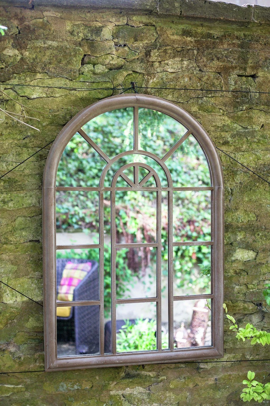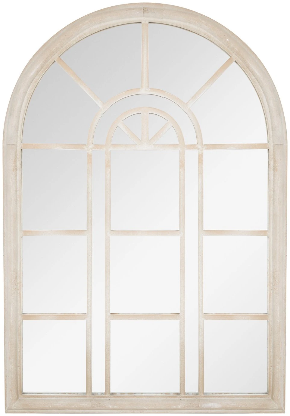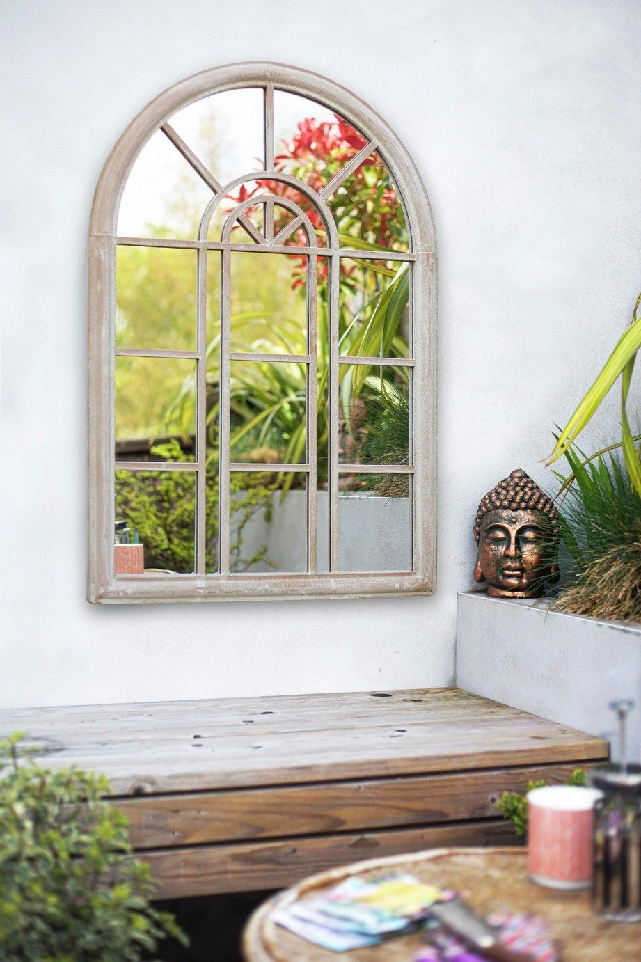 Boasting a rounded arch design with an art deco aesthetic and neutral stone-coloured finish, this mirror makes an attractive addition to any outdoor space. Arch shaped mirror.