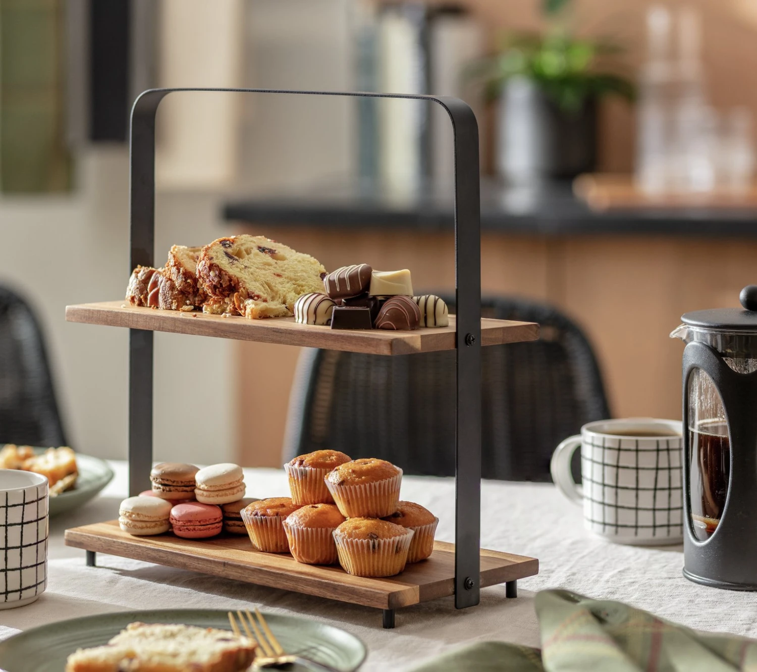 This industrial two tier serving platter is a great way to showcase your culinary creations. Two 100% Acacia wood boards are set in a stylish black metal frame. Create a dramatic, two level cheese board. Alternatively load your platter up with afternoon tea and carry it through to the lounge, it's portable. Finger sandwiches on top, cupcakes on the bottom. Delicious. Folds flat for easy storage.