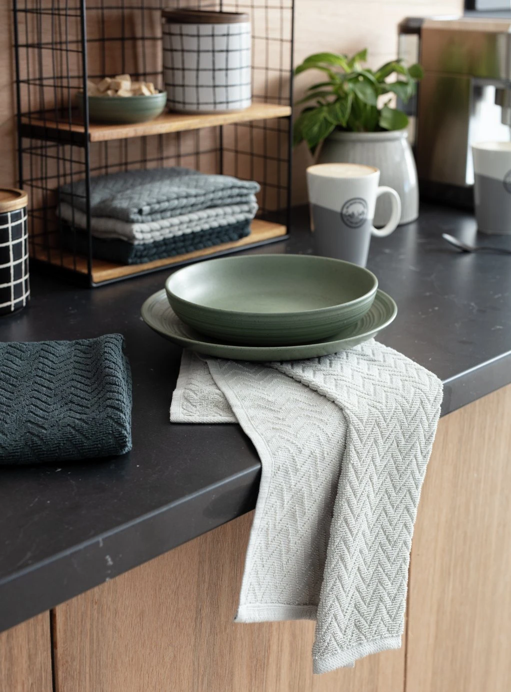 How useful is this set of 5 thick cotton tea towels? Answer, very. Made from terry toweling and in subtle muted colours, they feature a smart debossed zig zig design.